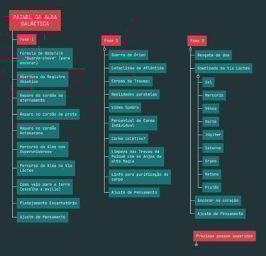 O objetivo do Painel da alma Galáctica é oferecer um diagnóstico amplo e profundo sobre a trajetória da Alma, mapeando os principais pontos para desbloqueios e também resgatando dons. Tudo isso resumido em uma única imagem de mapa mental.